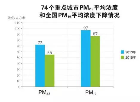 2015年,全國74個重點城市PM2.5平均濃度為55微克/立方米,相對于2013年的72微克/立方米下降23.6%;日均值超標天數的比例由2013年的33.2%降至2015年的20.8%。全國PM10平均濃度(338個城市平均濃度為87微克/立方米),相對2013年(330個城市平均濃度97微克/立方米)下降10.3%;日均值超標天數的比例由2013年的14.5%降至2015年的12.1%。74個重點城市共發生846天次重度污染和238天次嚴重污染,較2014和2013年降幅分別為28.1%、24.9%以及49.9%、63.7%。京津冀、長三角、珠三角和成渝地區NO2濃度相對2013年分別下降9.8%、11.9%、19.5%和15.8%,SO2分別下降44.9%、30.0%、38.1%和48.3%。衛星資料反演顯示,2013~2015年,全國NO2和SO2垂直柱濃度年均值和顆粒物光學厚度(AOD)總體呈下降趨勢,與地面監測數據分析結果一致。