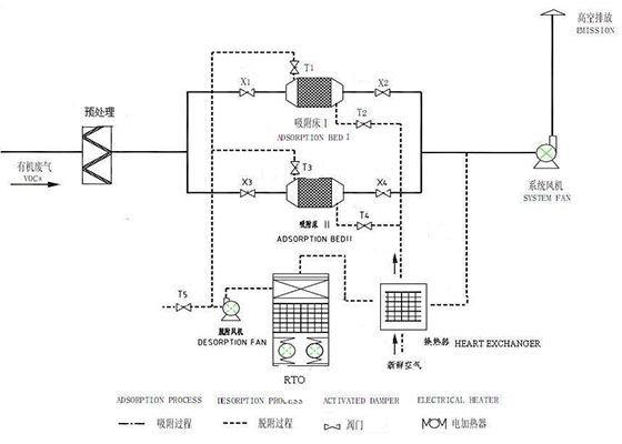 2、如果是成分特別復雜的工業有機廢氣,處理的方式為:“吸附+脫附+催化燃燒”工藝。經過催化燃燒后的有機廢氣轉化為二氧化碳和水直接排放,工藝簡單而且處理效果好,催化燃燒后的預熱可以再利用。